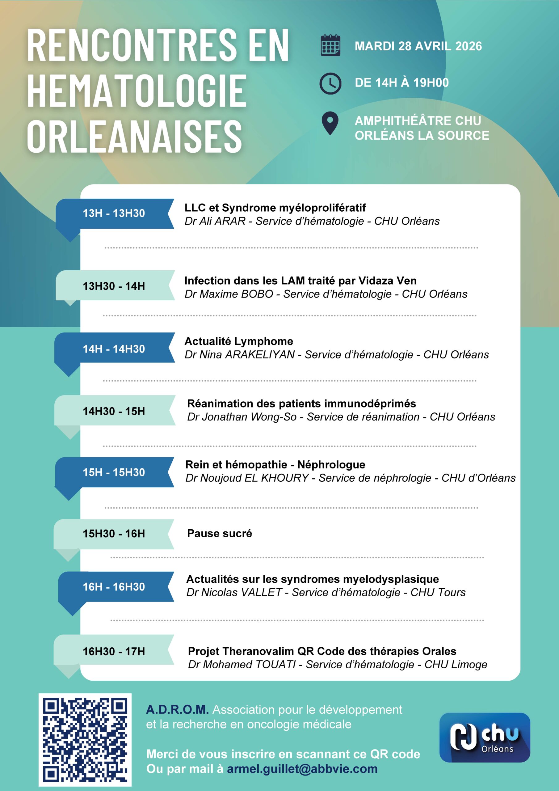 Jeudi prochain, l'Association pour le Développement et la Recherche en Oncologie Médicale (A.D.R.O.M) organise la seconde édition des rencontres en hématologie orléanaises !