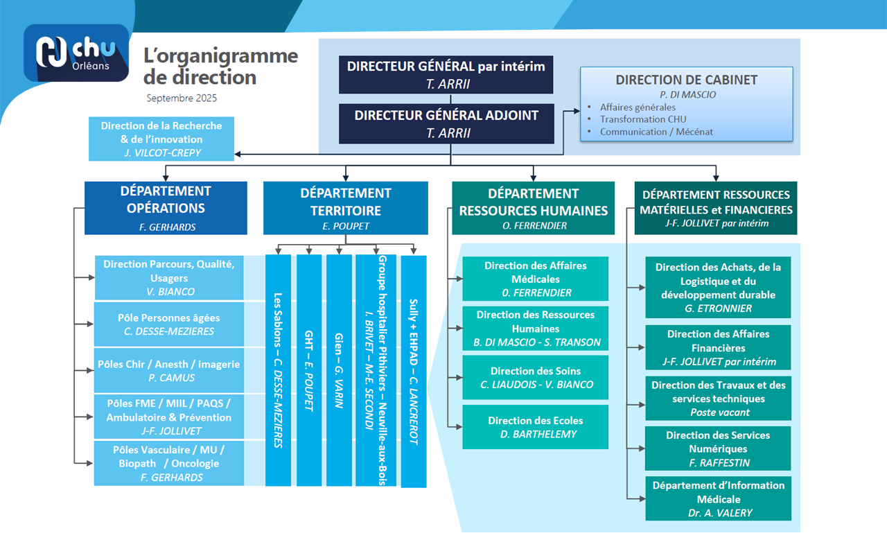 Conformément aux dispositions de l’article L.6143-7-4 du Code de la santé publique, le directoire du CHU d’Orléans approuve le projet médical et prépare le projet d’établissement, notamment sur la base du projet de soins infirmiers, de rééducation et médico-techniques. Il conseille le directeur général dans la gestion et la conduite de l’établissement.